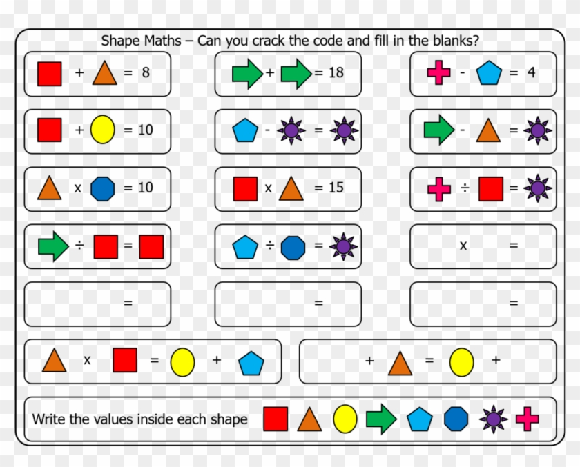 Maths Shapes Puzzles : Last math equation is 2+4*3 = 2+12 = 14.. Third equation t*s=6 => 3*s=6 => s=2. Apr 17, 2019 · answer of this shapes math picture puzzle, can be viewed by clicking on the answer button. The iq puzzles on this page, our level 1 brain teasers, are a collection of number and math puzzles, shape pattern puzzles, shape sequence puzzles for kids, puzzles with dice and dominoes, time puzzles, letter puzzles and logic. Last math equation is 2+4*3 = 2+12 = 14. The difficulty of the math and letter puzzles is the equivalent of math grades 1 to 3.